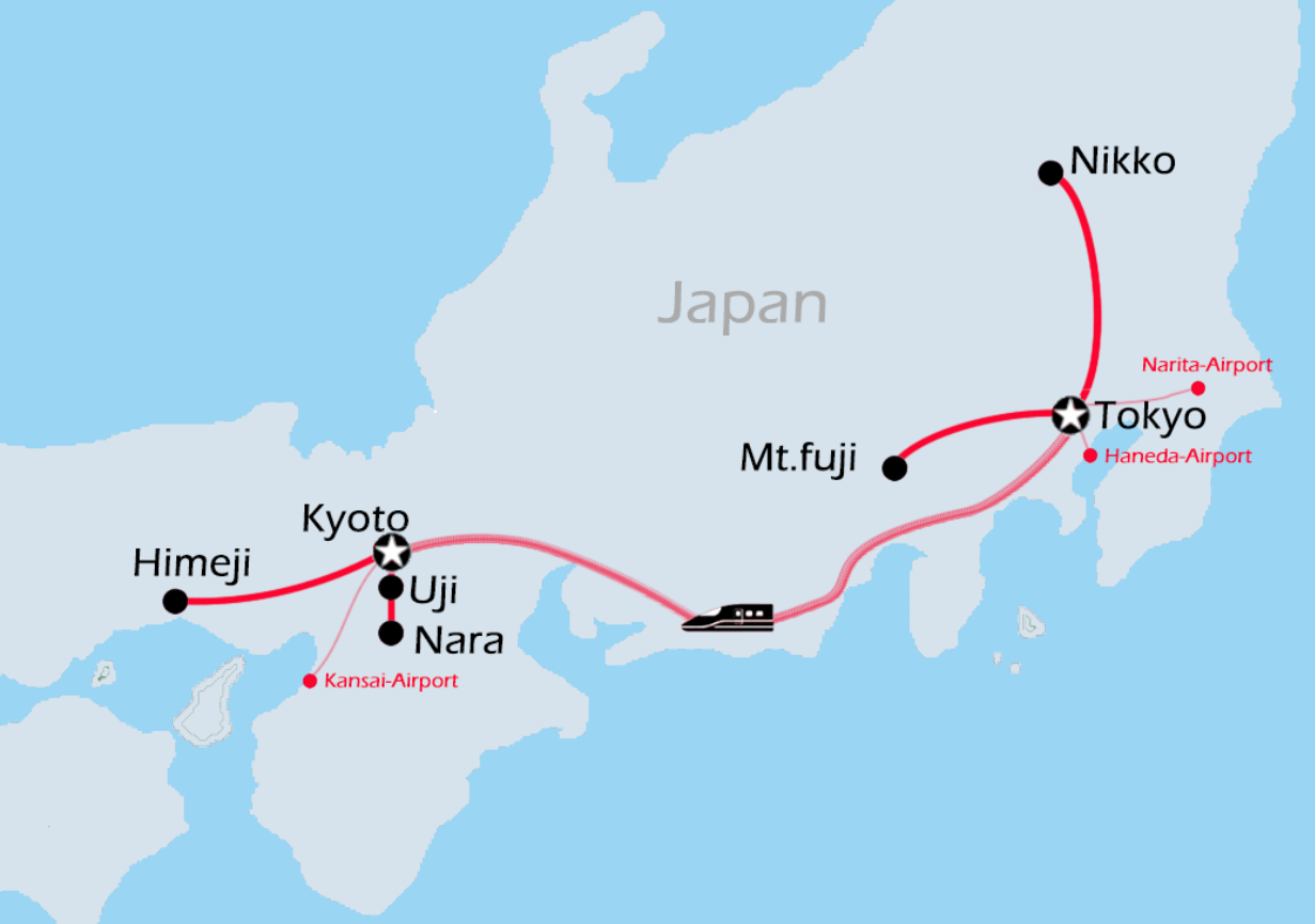 Tour Route: Tokyo(4N) - Mt. Fuji - Nikko - Kyoto(5N) - Uji - Nara - Himeji