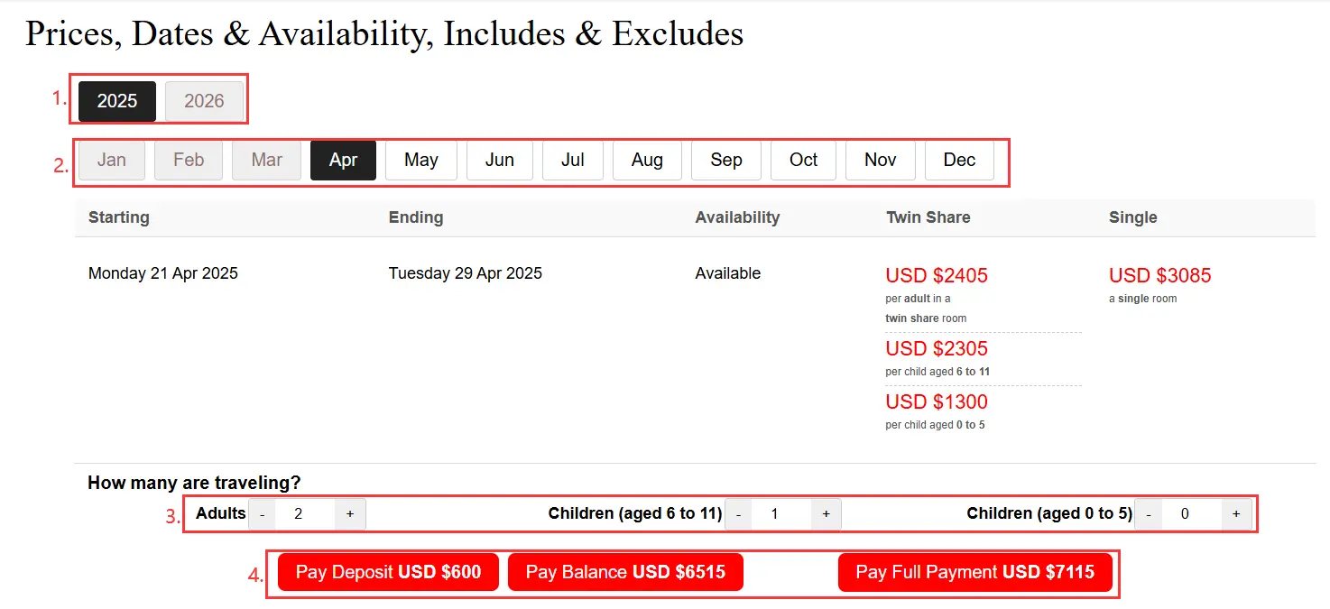 After carefully reviewing all information of the tour package you choose, go to the "Prices, Dates, Availability, Includes & Excludes" section. Select your preferred departure date and number of participants, click "-" or "+" to match your "Travelers" Numbers, the total amount of deposit/balance/full payment will be automatically calculated. Then click the corresponding payment button to continue reservation.