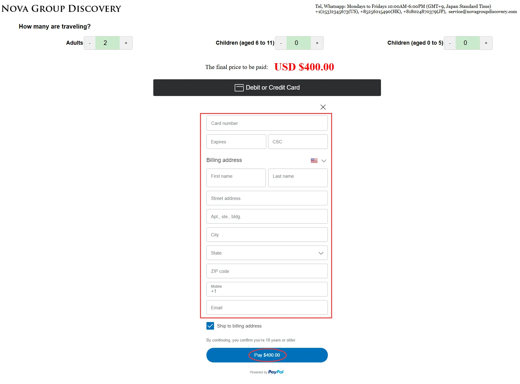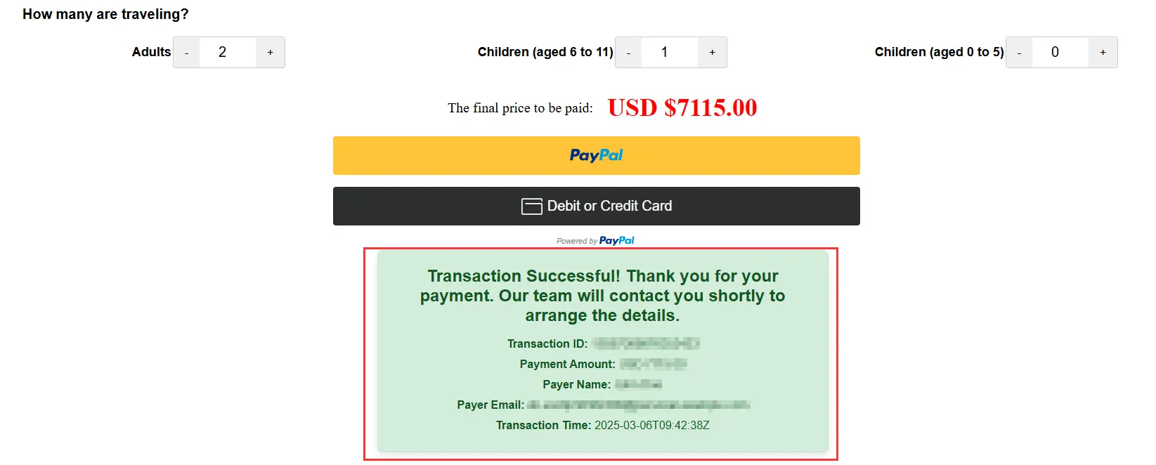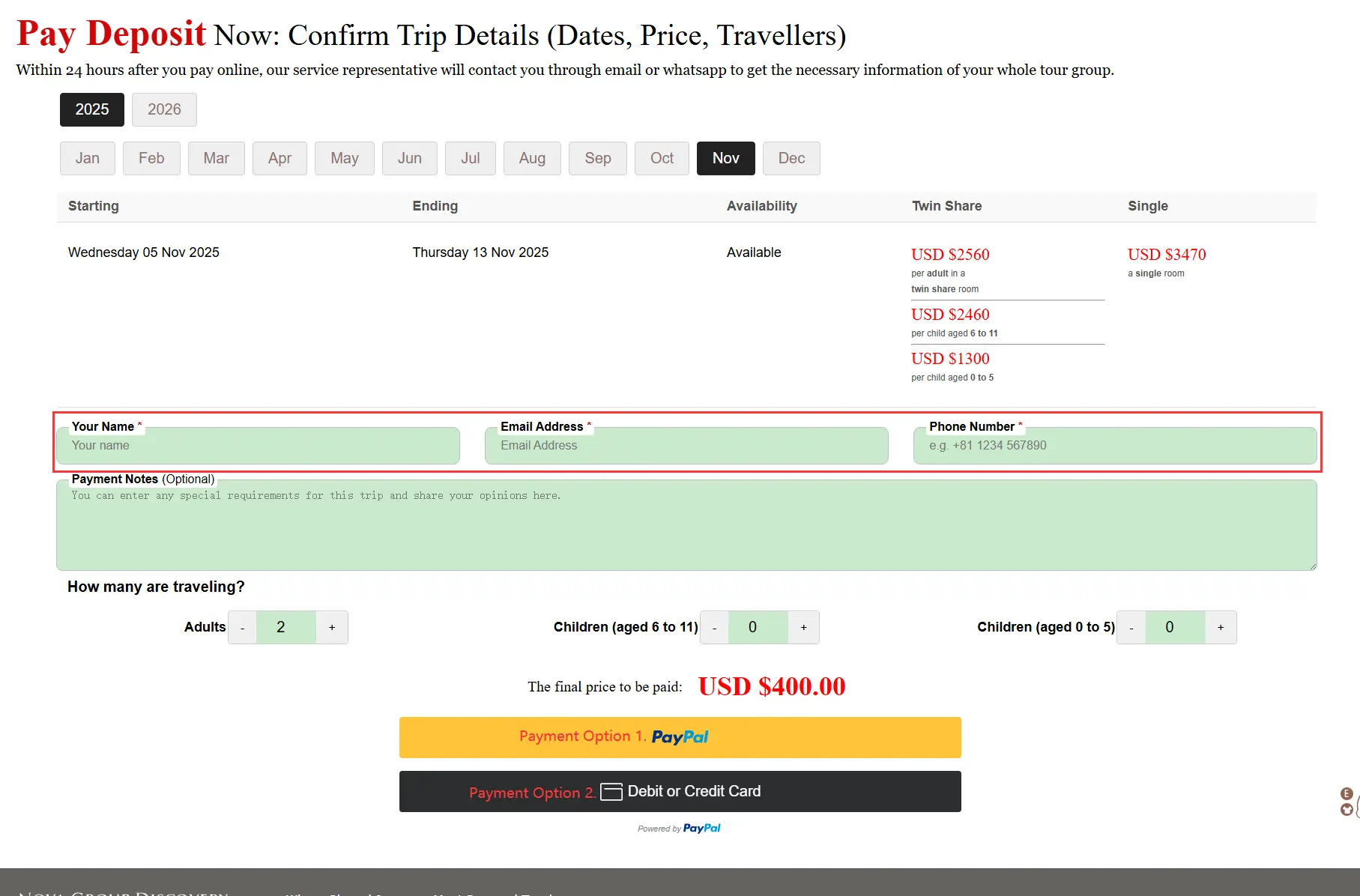 You'll be directed to the payment page. Double-check your tour date, group size, and the system-calculated total payment amount. If correct,enter your full name, email address, and phone number. Choose your preferred payment method below.